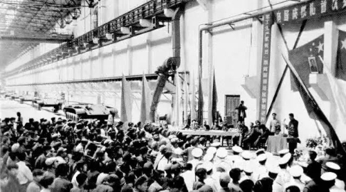 1959年8月22日,凝結著干部職工心血和汗水的32輛59式坦克,比建廠時計劃進度提前一年交付部隊,經過嚴格考核試驗后參加了建國十周年國慶大閱兵。