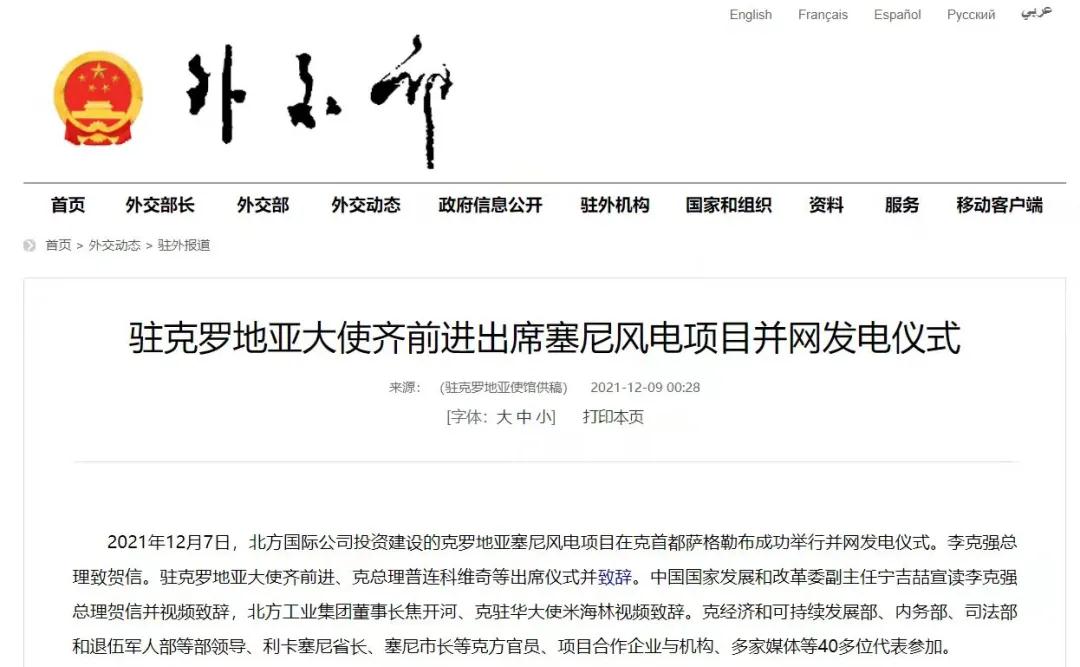 2021年12月7日,中國兵器工業集團有限公司北方公司所屬北方國際投資、建設和運營的塞尼156MW風電項目在克羅地亞首都薩格勒布隆重舉行并網發電儀式。李克強總理致賀信。克羅地亞總理安德烈·普連科維奇,中國駐克羅地亞大使齊前進出席儀式并致辭。中國國家發展和改革委員會副主任寧吉喆宣讀李克強總理賀信并視頻致辭,中國兵器工業集團有限公司董事長焦開河、克駐華大使米海林視頻致辭。