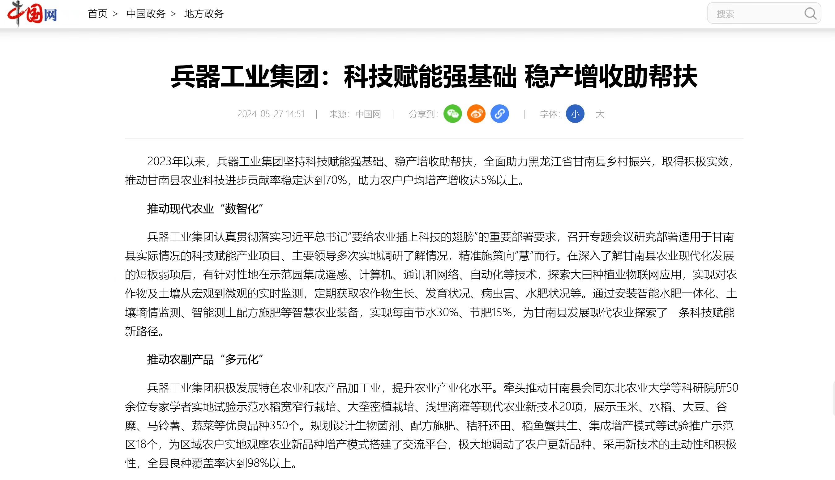 5月27日,中國網刊發《兵器工業集團:科技賦能強基礎 穩產增收助幫扶》,對中國兵器工業集團有限公司全面助力黑龍江省甘南縣鄉村振興,推動甘南縣農業科技進步情況作了報道。